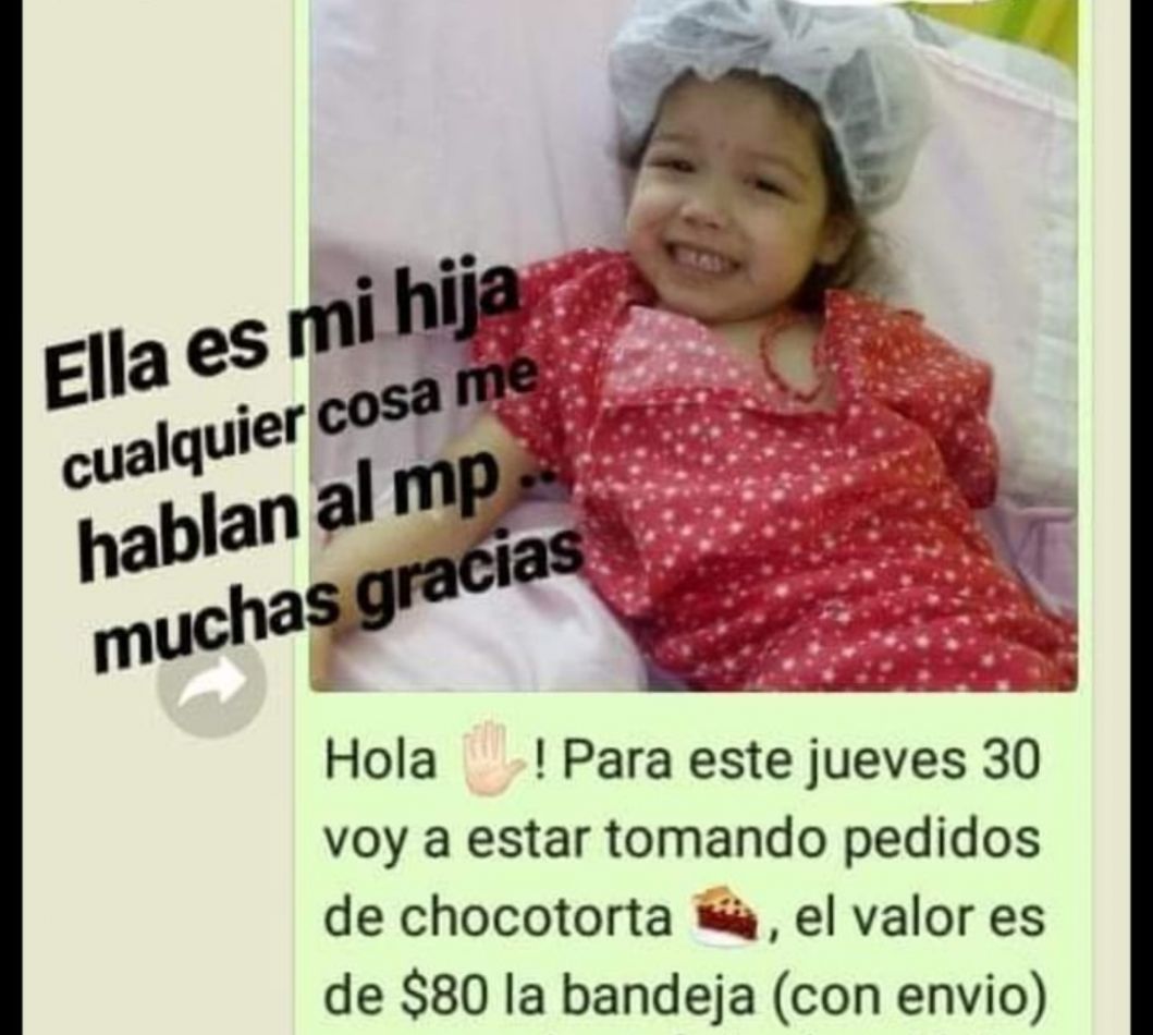 "Hola, para este jueves 30 voy a estar tomando pedidos de chocotorta, el valor es de $80 la bandeja (con envío), que es a beneficio de mi hija Oriana".